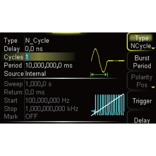 It supports scanning output from low frequency to high frequency or from high frequency to low frequency. The scanning type includes linear, logarithmic and step. It can set the “mark” frequency to meet the needs of more amplitude frequency test applications. Burst mode function provides N-cycle, infinite and gating three types of pulse strings.