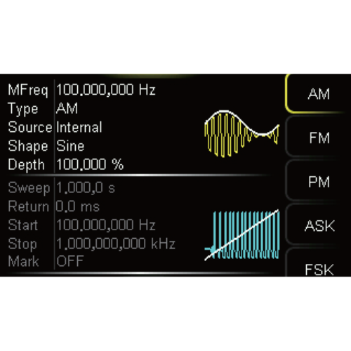 Modulation types include am, FM, PM, ask, FSK, PSK and PWM, and support internal and external modulation sources to meet the needs of more teaching or communication system testing.